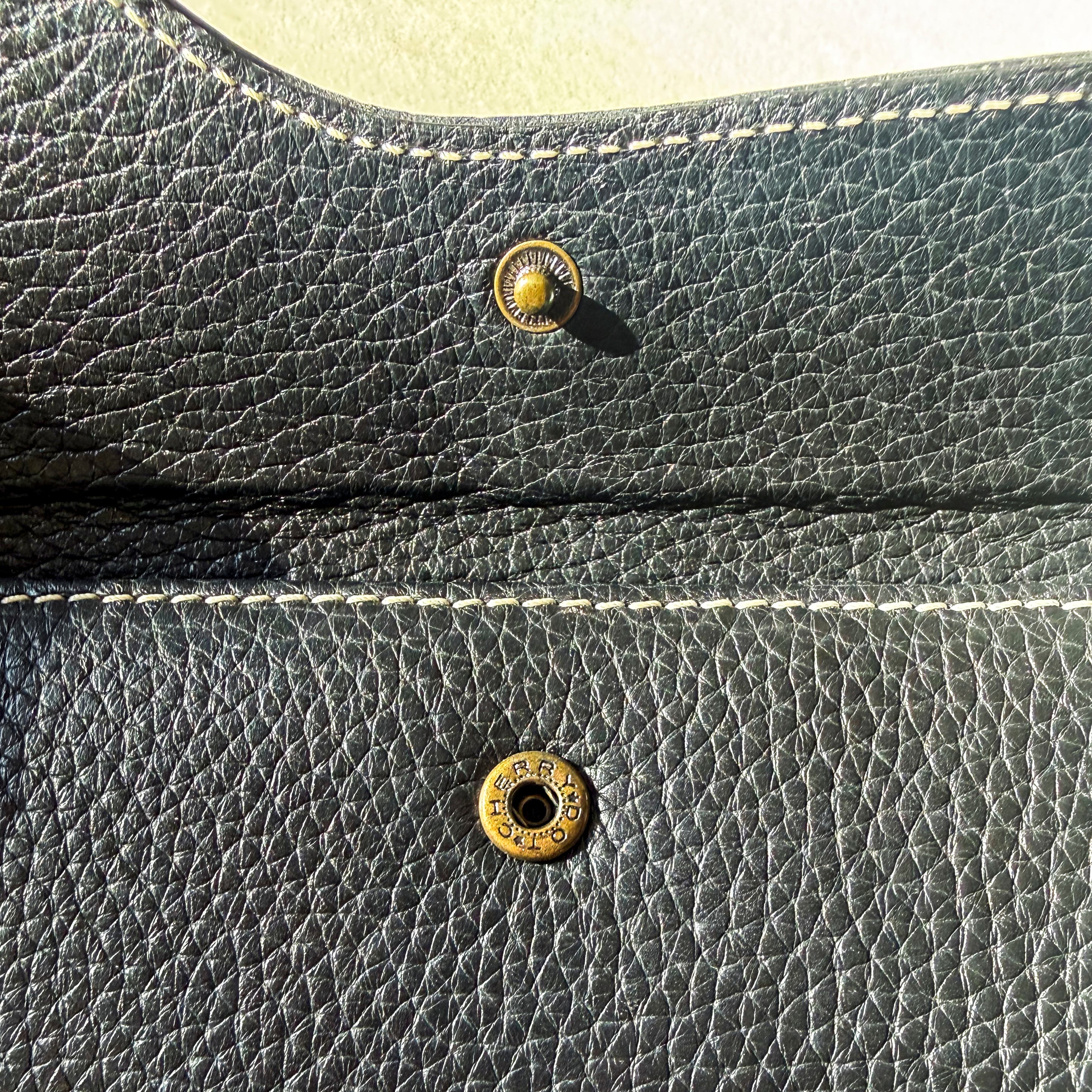 Leather with silver-tone D logo hardware.