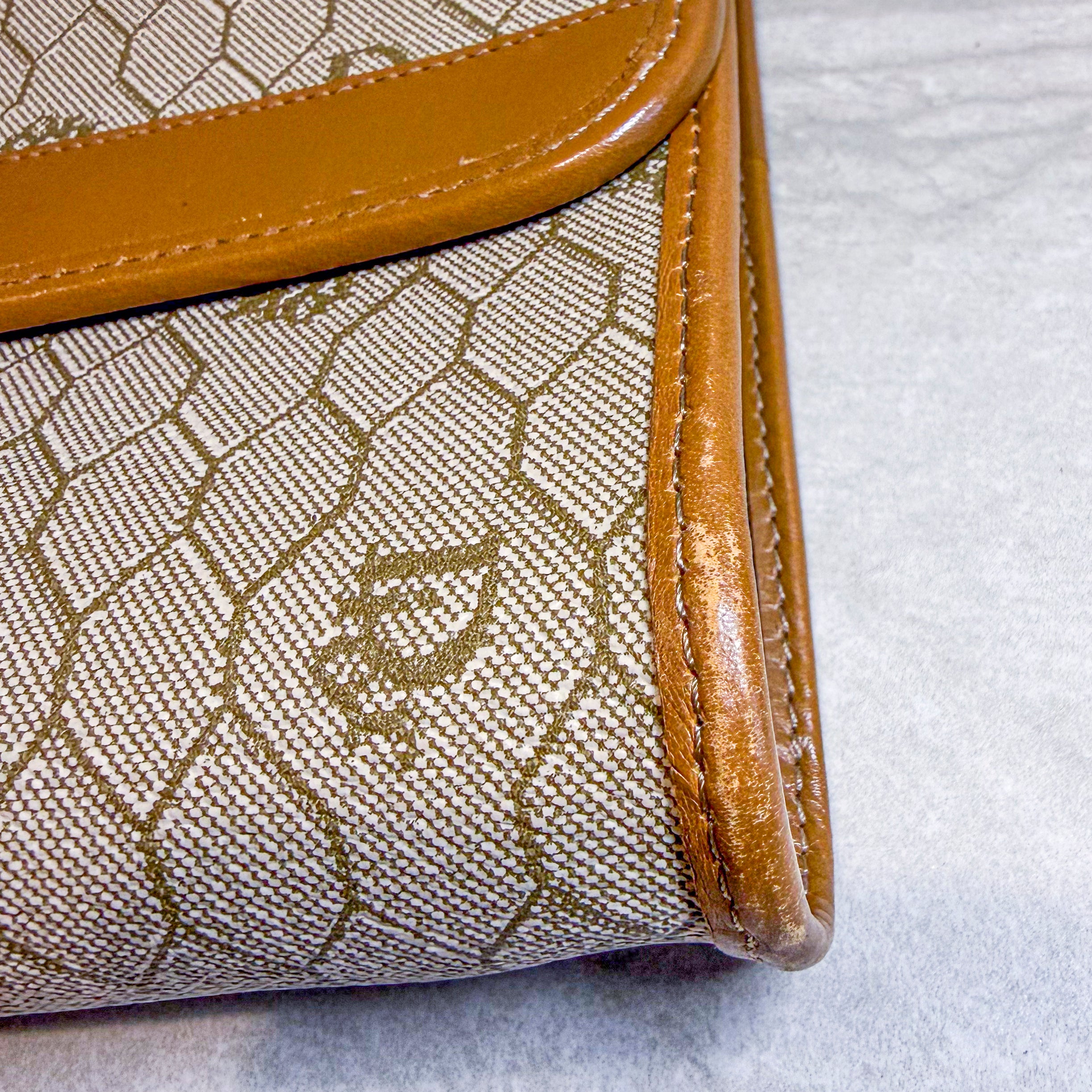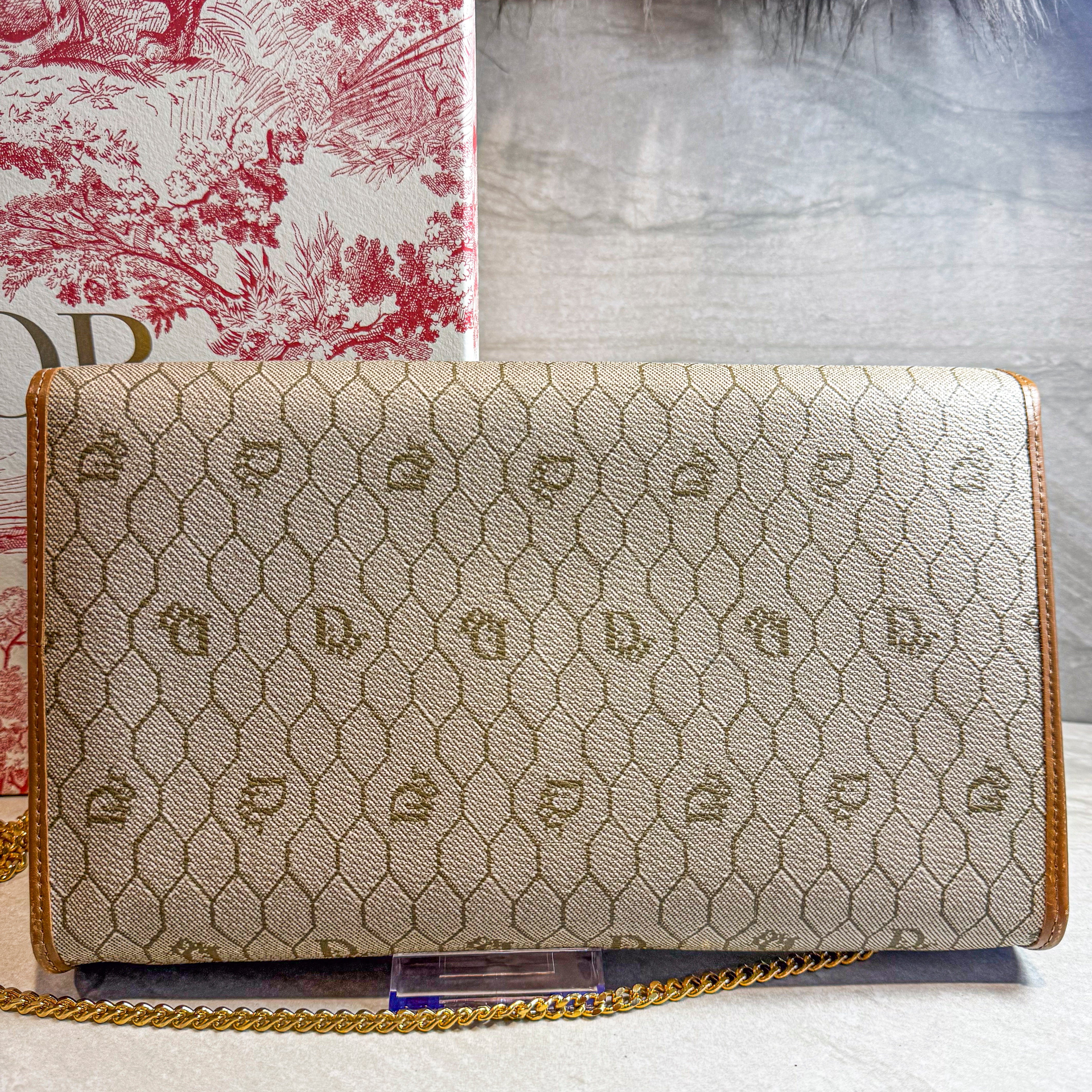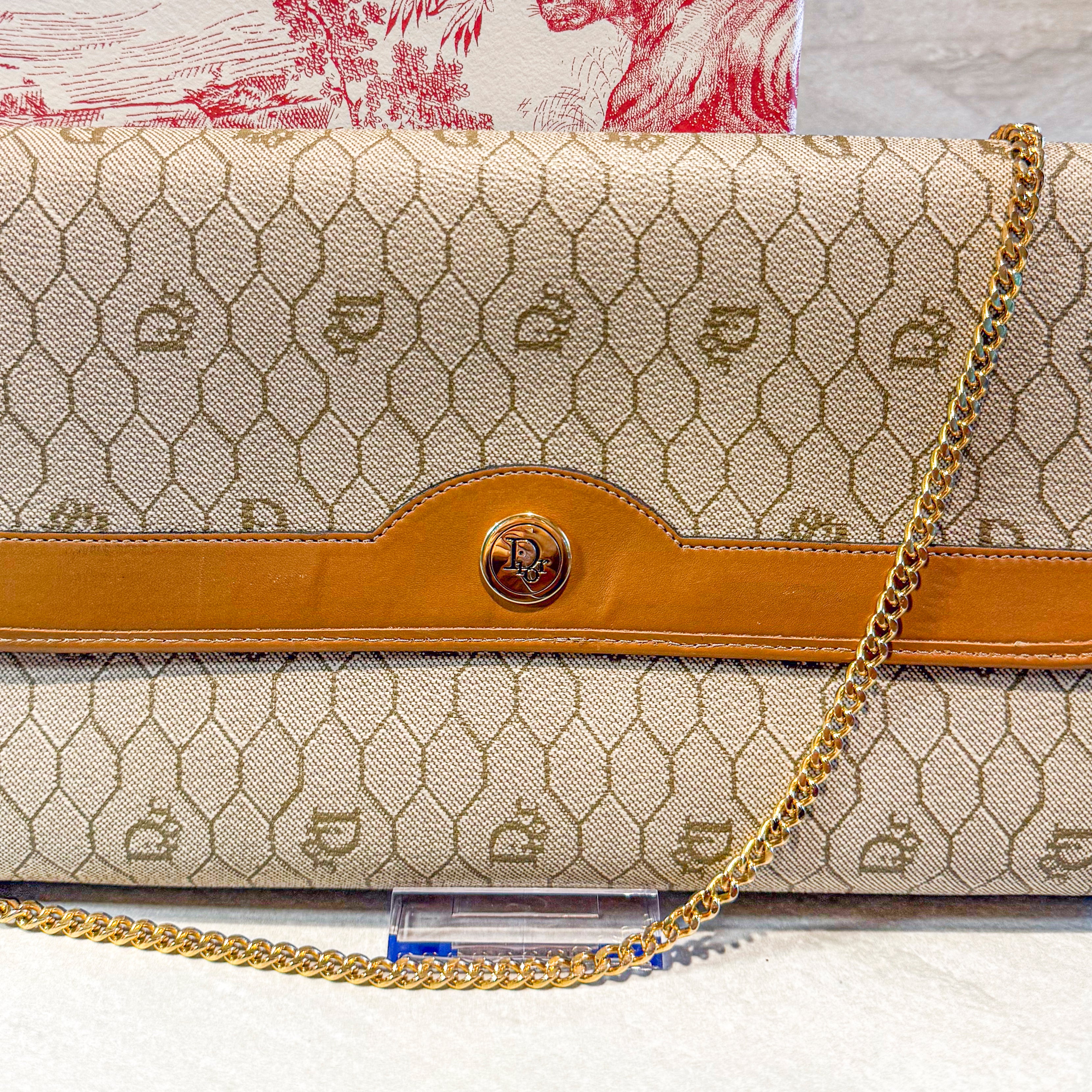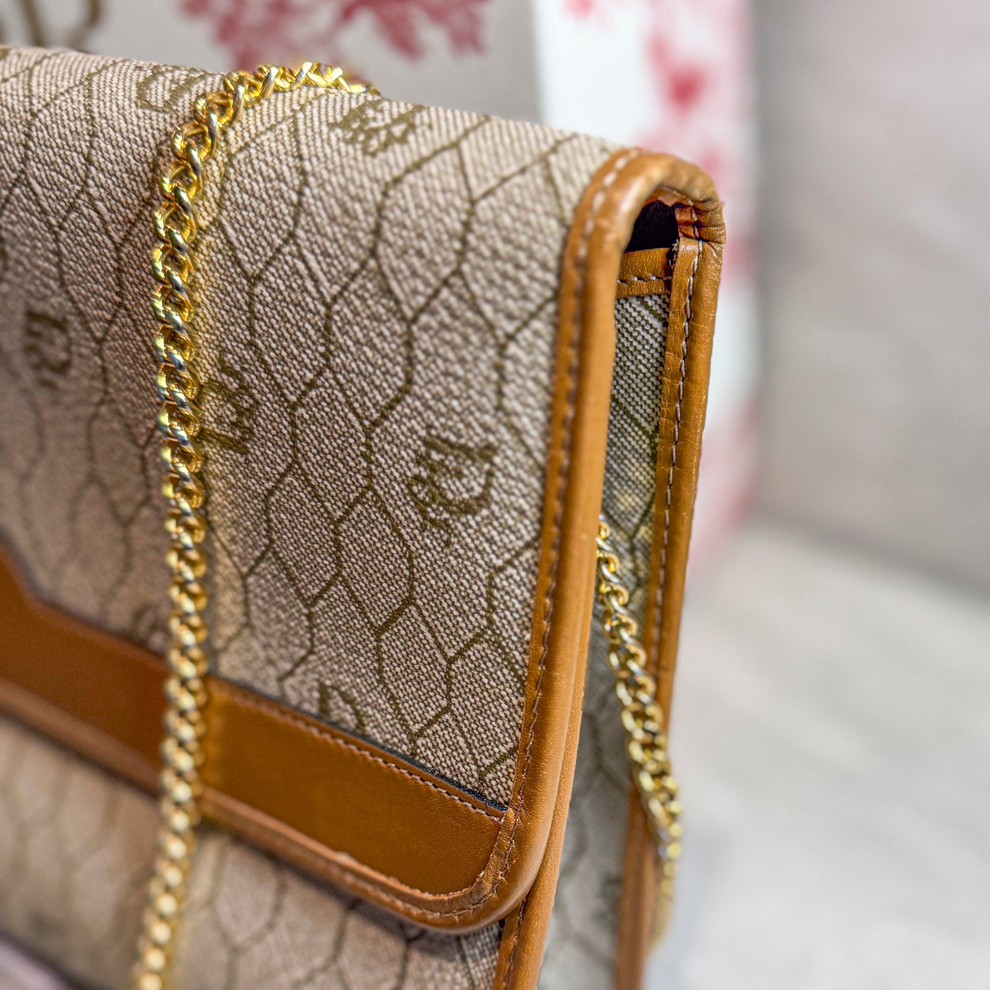 Charming vintage Christian Dior crossbody bag featuring the classic Honeycomb canvas pattern with tan leather trim and gold chain strap. The Dior Honeycomb pattern - originally designed by Marc Bohan in 1967 - has experienced a major resurgence, becoming one of the most sought-after heritage prints in luxury fashion. The compact size is perfect for essentials while the timeless design ensures lasting style. A piece from Dior's celebrated archives that pairs effortlessly with both casual and dressed-up looks.