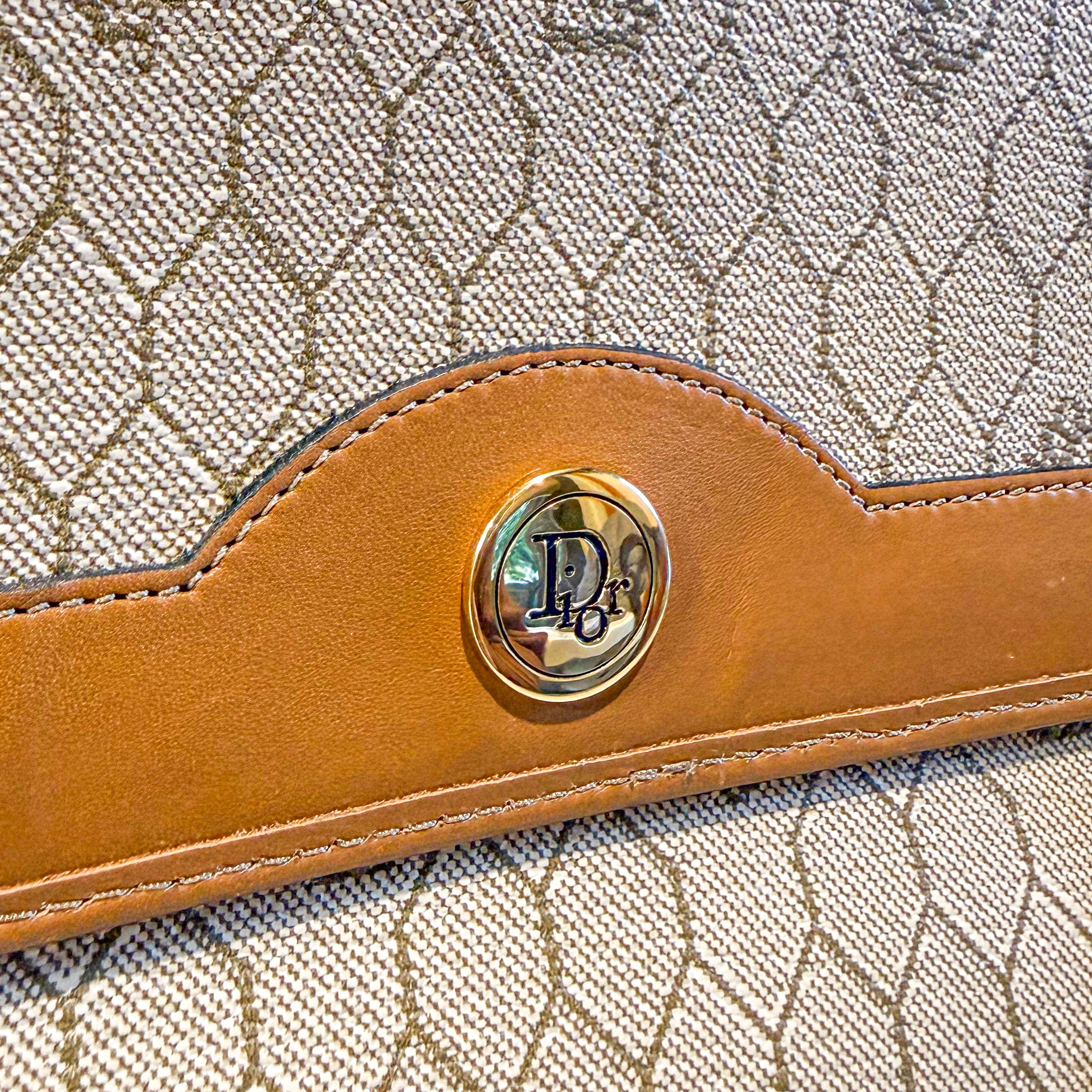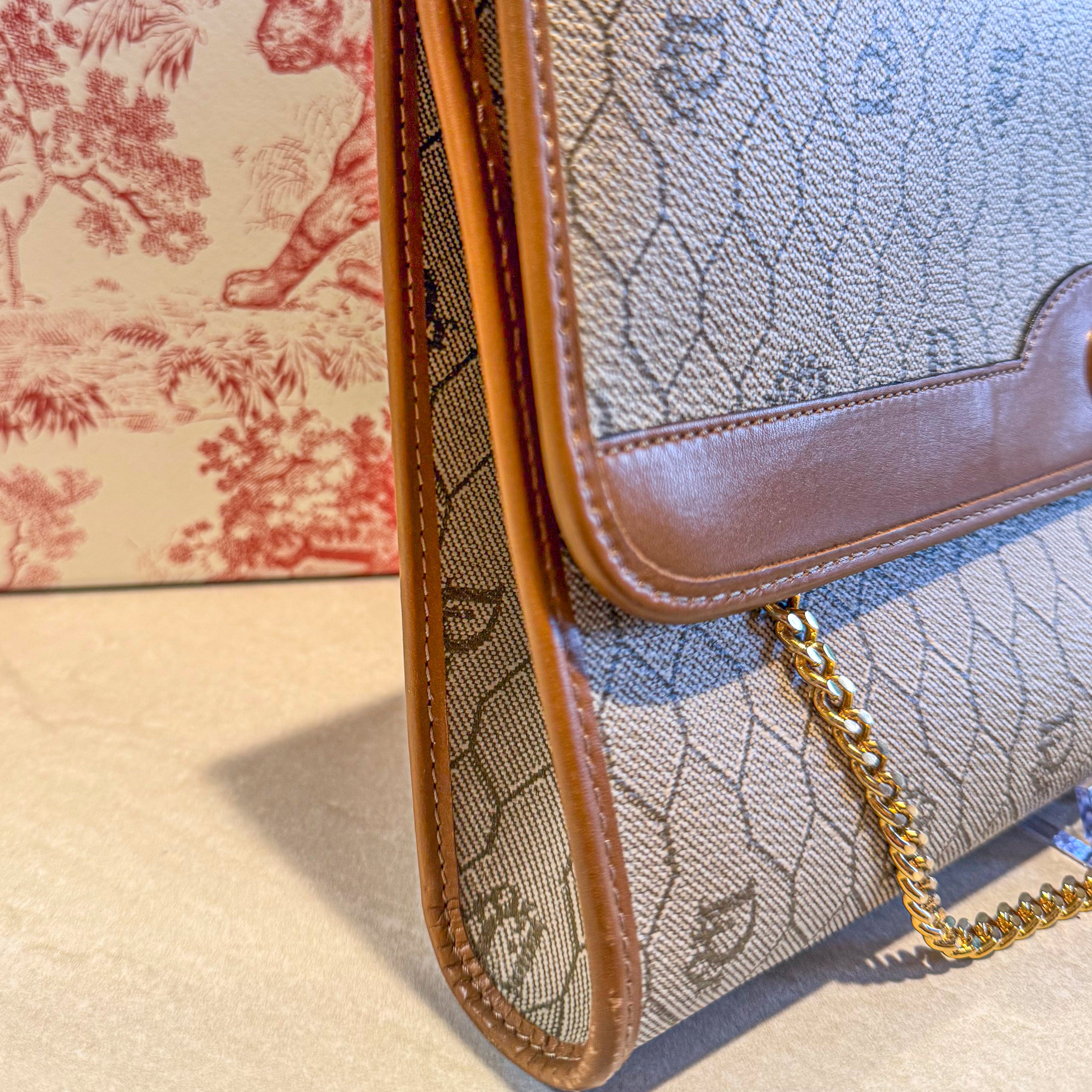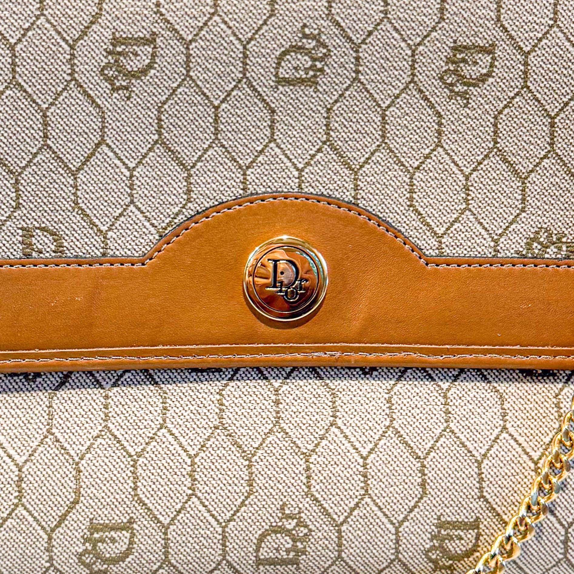 Charming vintage Christian Dior crossbody bag featuring the classic Honeycomb canvas pattern with tan leather trim and gold chain strap. The Dior Honeycomb pattern - originally designed by Marc Bohan in 1967 - has experienced a major resurgence, becoming one of the most sought-after heritage prints in luxury fashion. The compact size is perfect for essentials while the timeless design ensures lasting style. A piece from Dior's celebrated archives that pairs effortlessly with both casual and dressed-up looks.