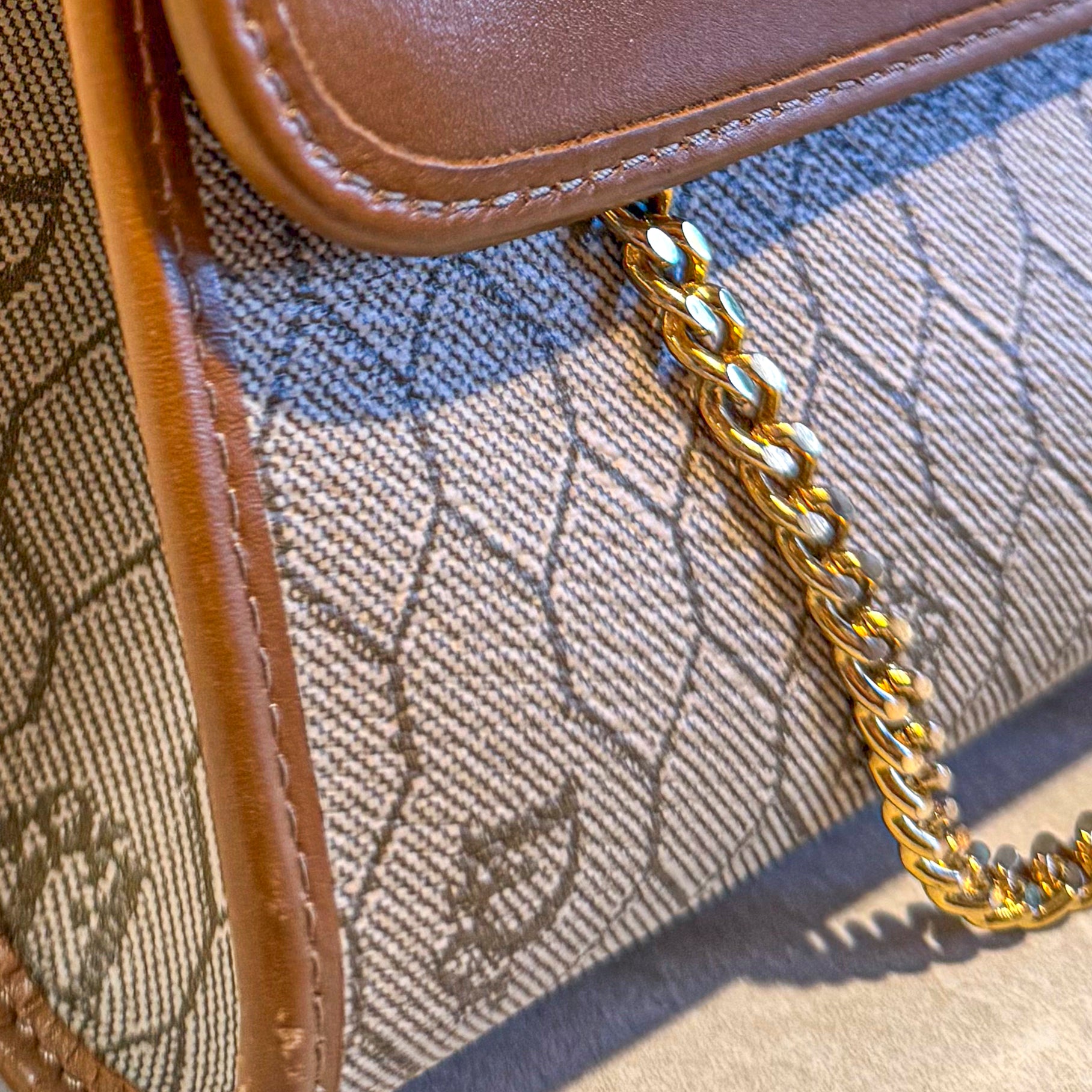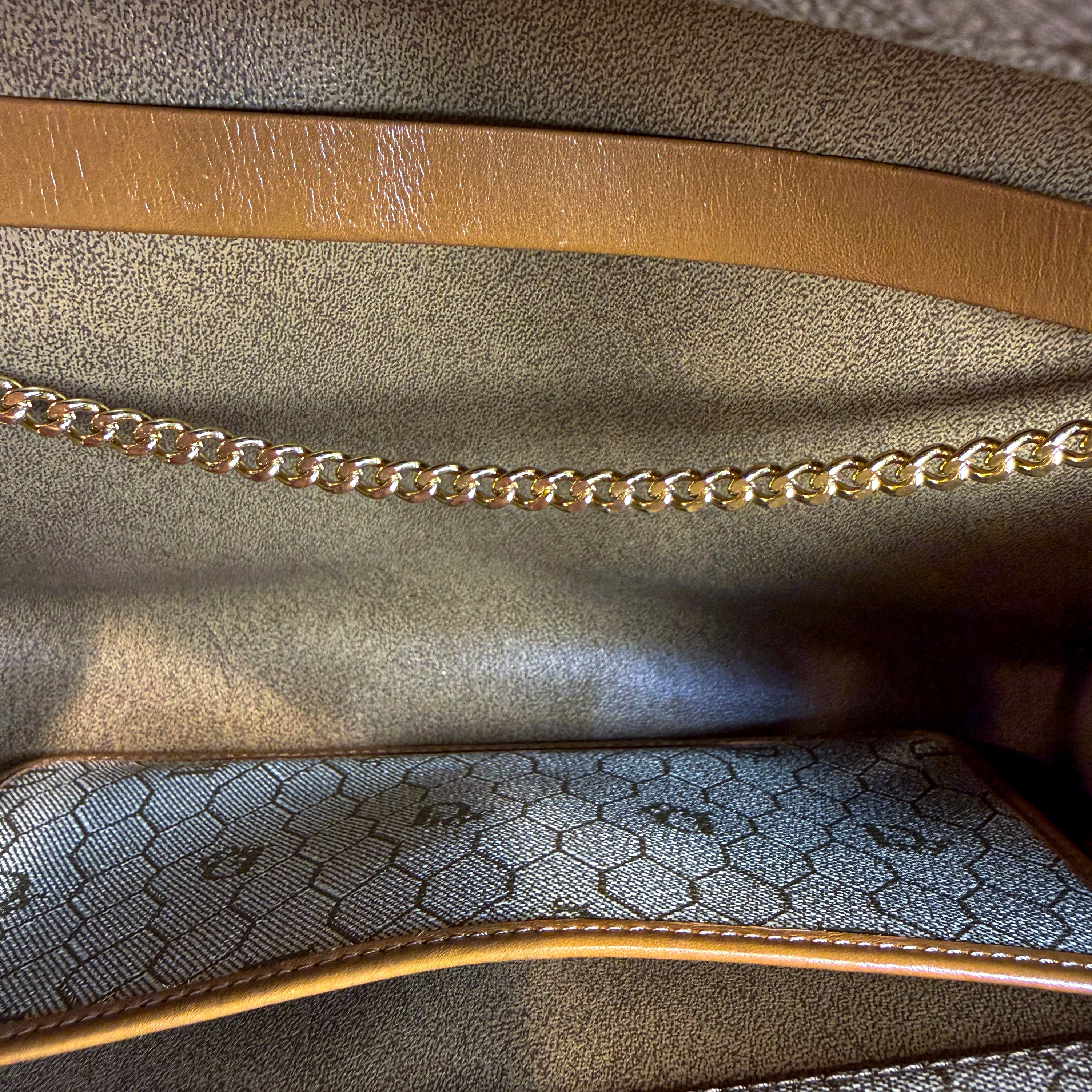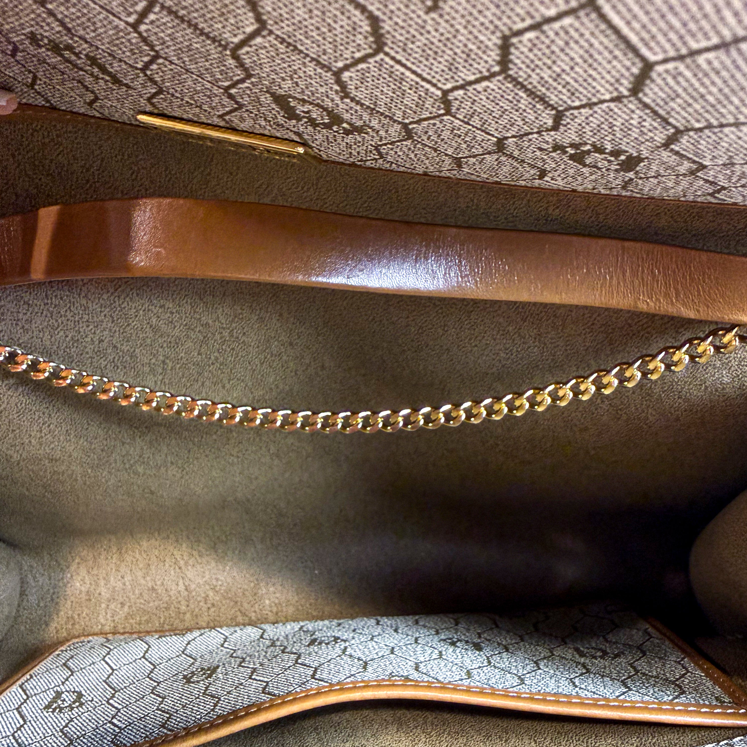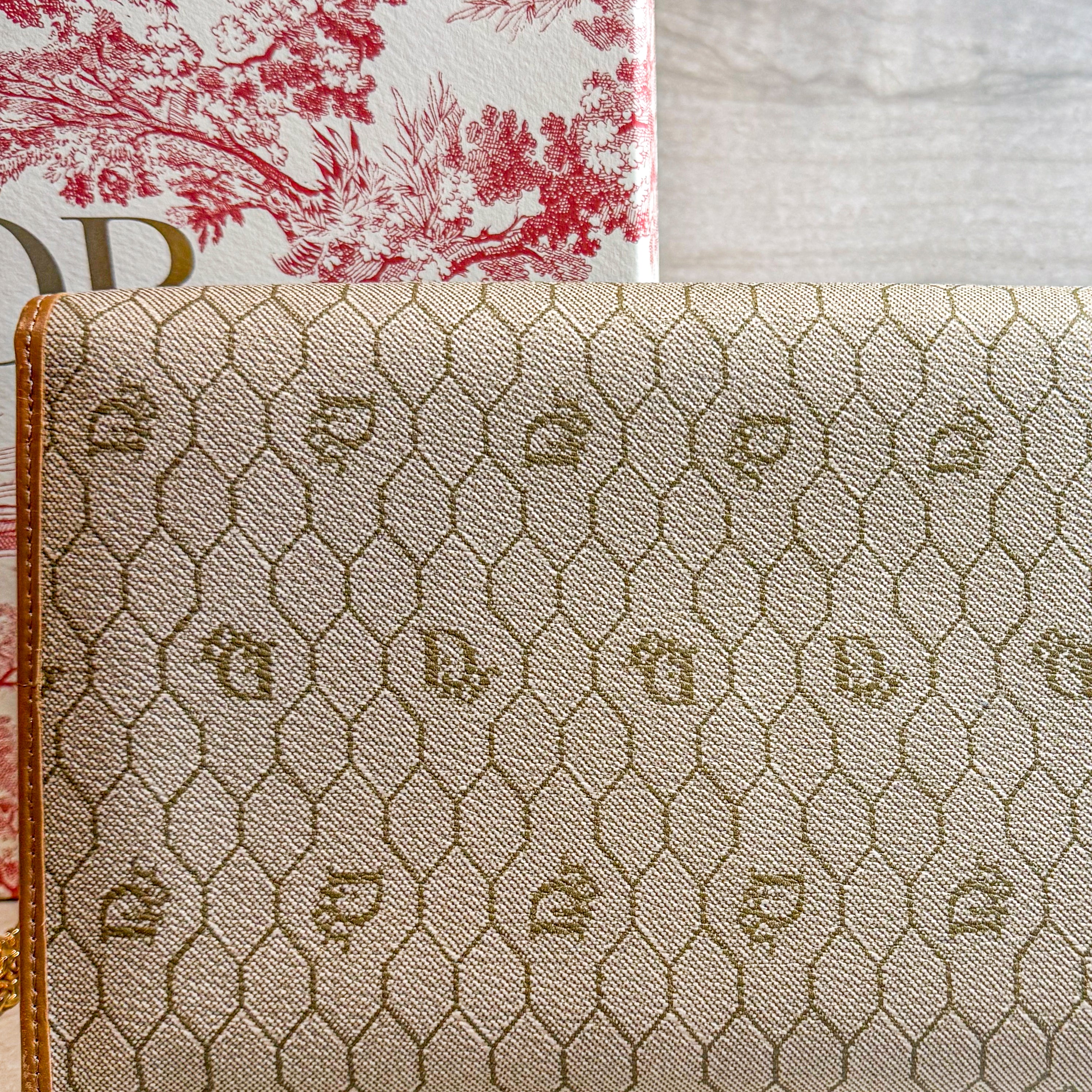 Charming vintage Christian Dior crossbody bag featuring the classic Honeycomb canvas pattern with tan leather trim and gold chain strap. The Dior Honeycomb pattern - originally designed by Marc Bohan in 1967 - has experienced a major resurgence, becoming one of the most sought-after heritage prints in luxury fashion. The compact size is perfect for essentials while the timeless design ensures lasting style. A piece from Dior's celebrated archives that pairs effortlessly with both casual and dressed-up looks.