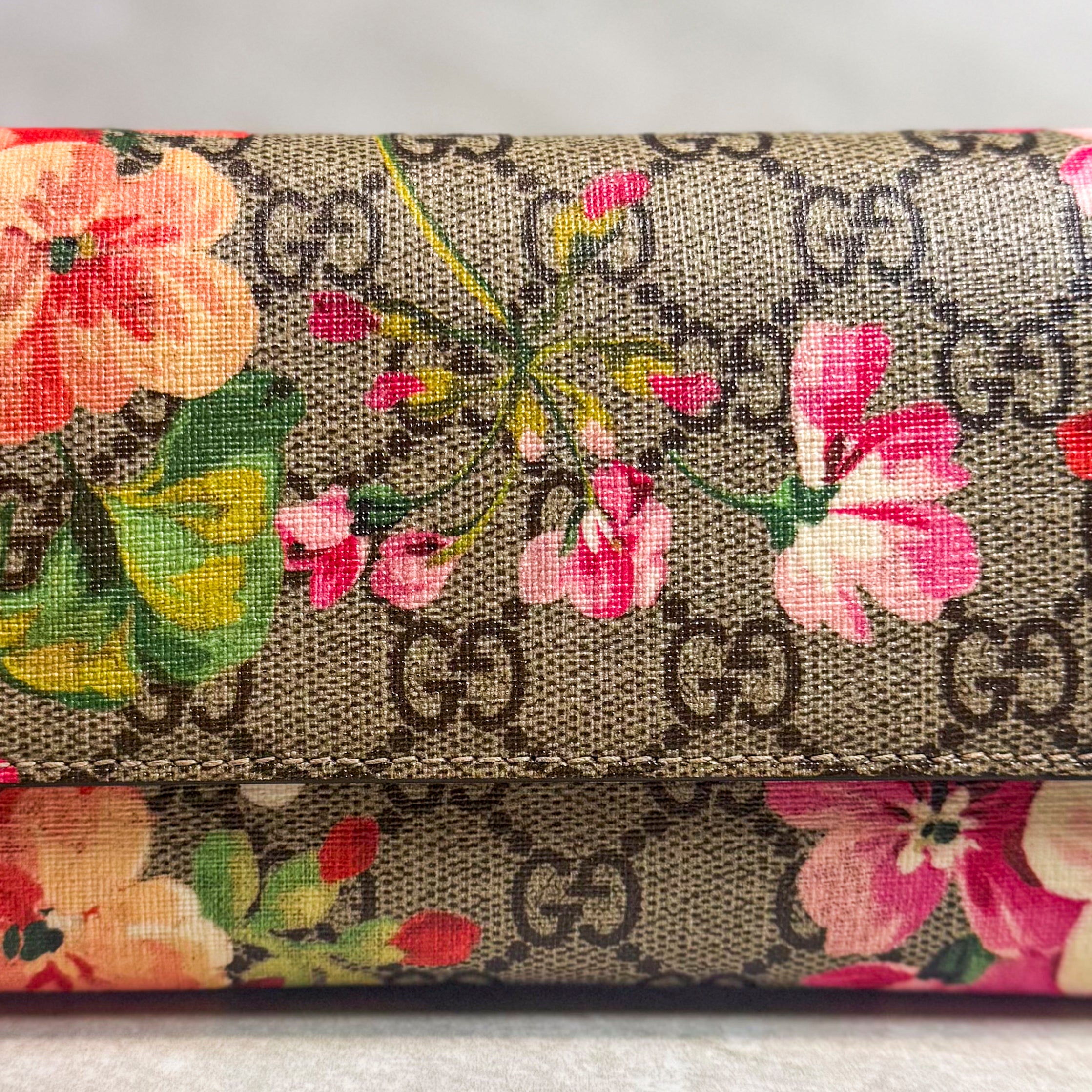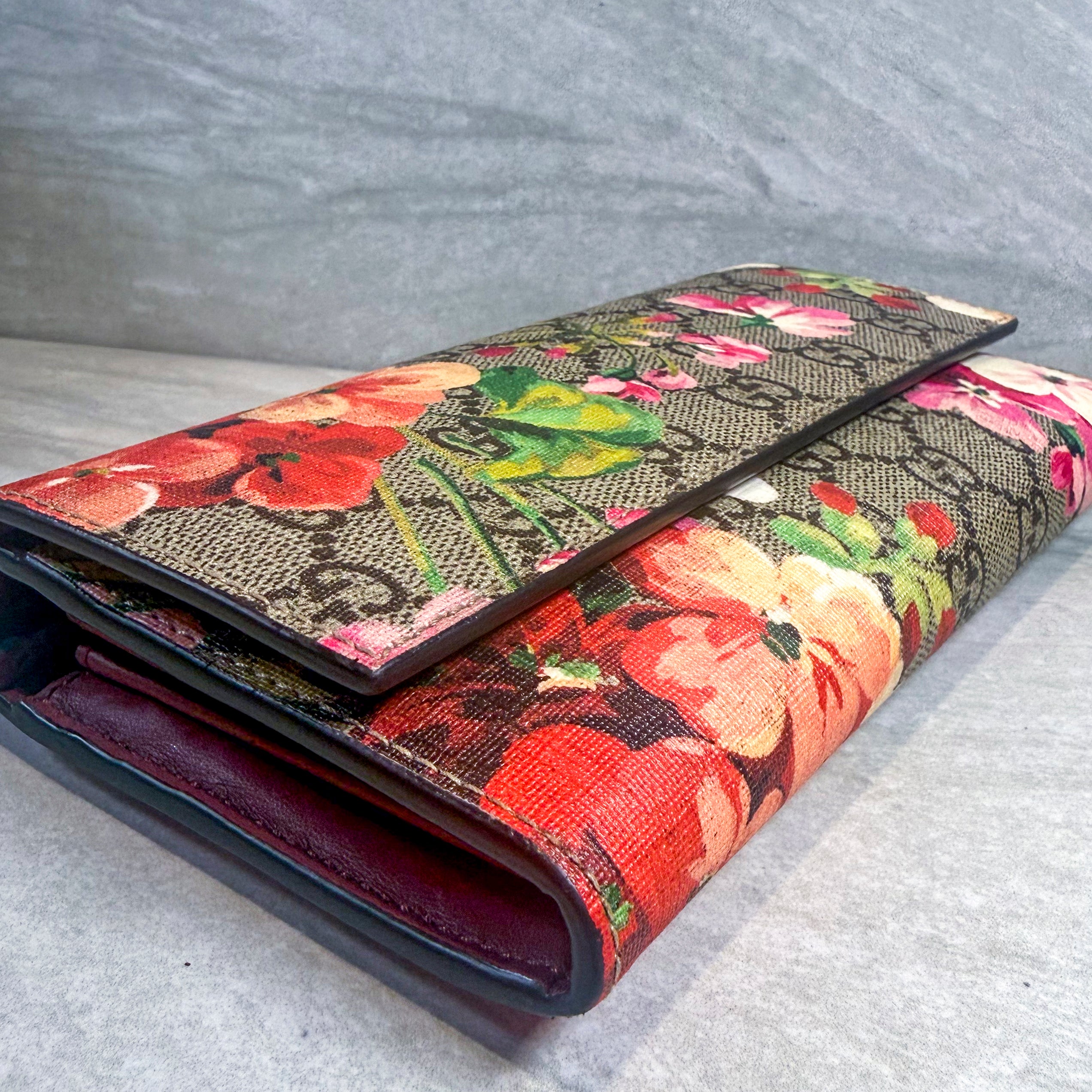 Gucci GG Supreme wallet featuring the Blooms print with vibrant floral overlay on the signature coated canvas.