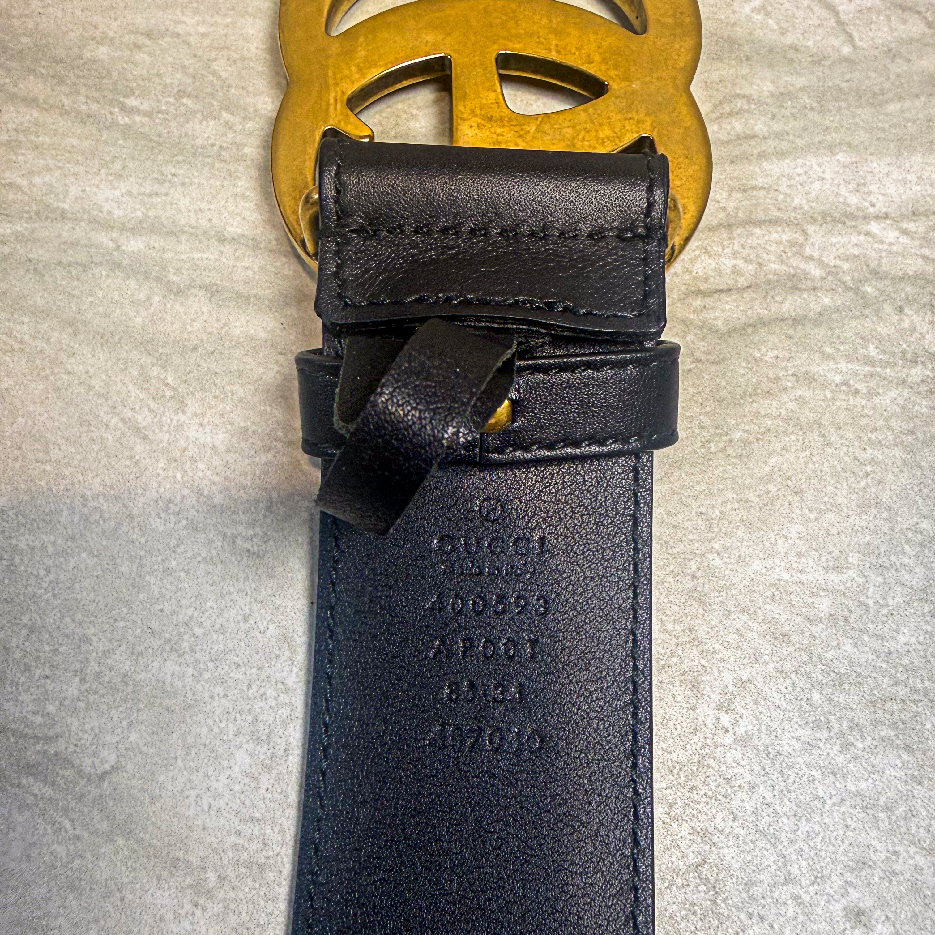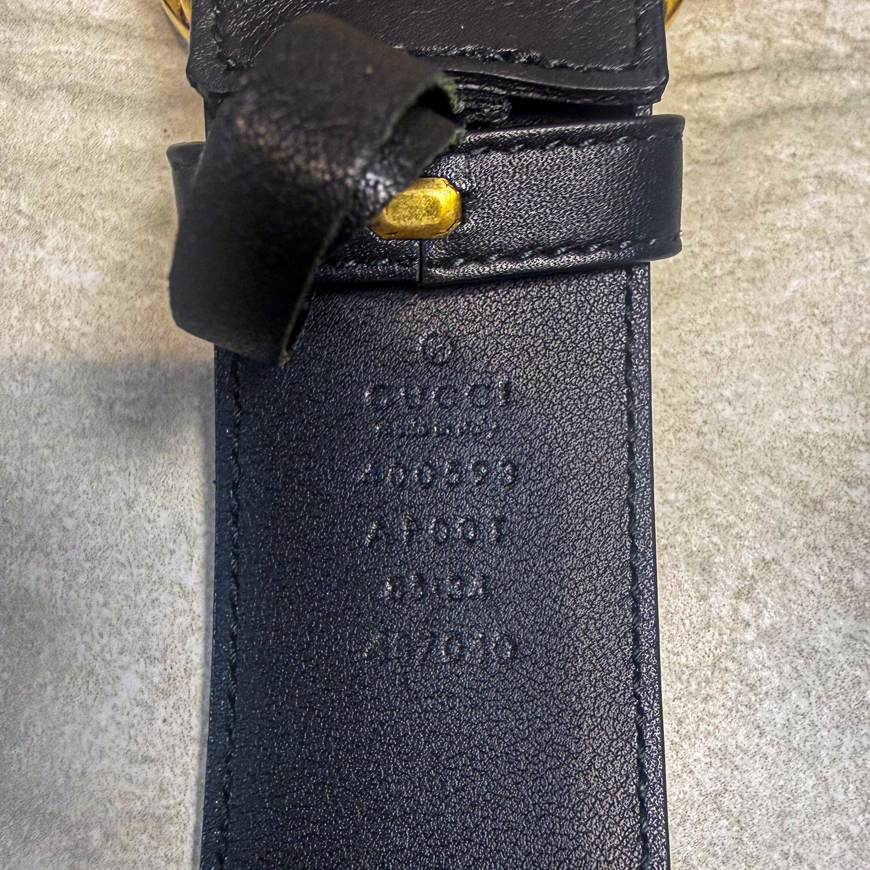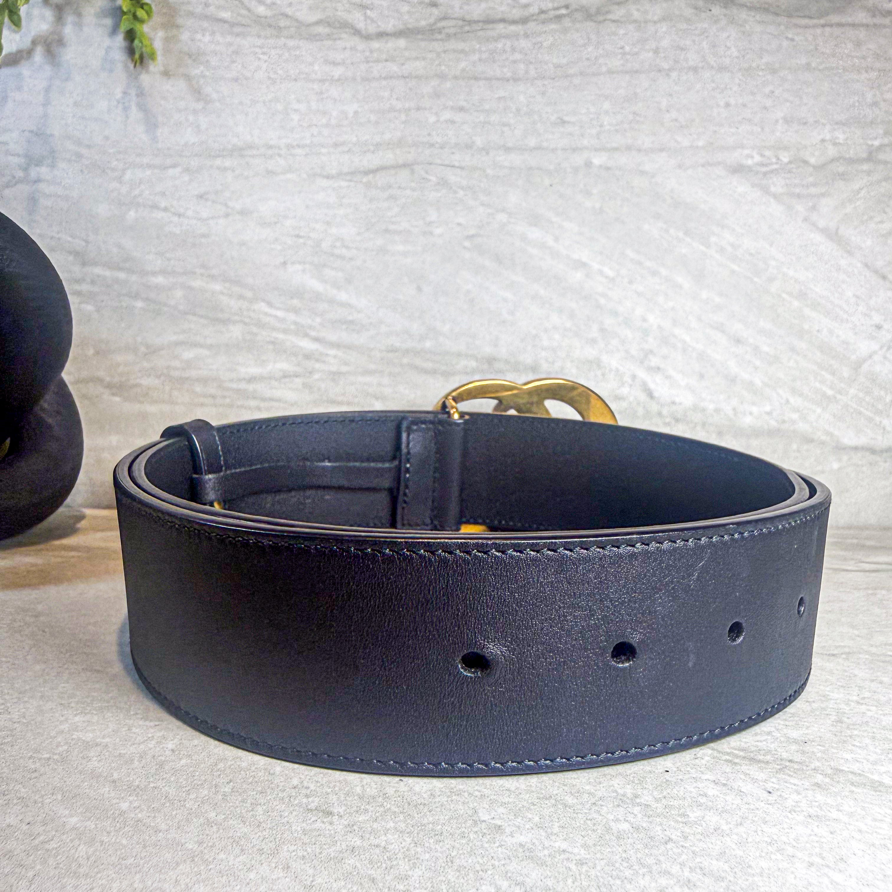 Iconic Gucci GG Marmont belt featuring the antique gold-tone double G buckle on supple black leather. First introduced in 2016 under Alessandro Michele's creative direction, the Marmont belt quickly became one of the most coveted accessories in fashion - a staple seen on influencers and in street style around the world. This versatile piece instantly elevates jeans, dresses, and blazers alike. Size Small. Like new condition with dust bag included.