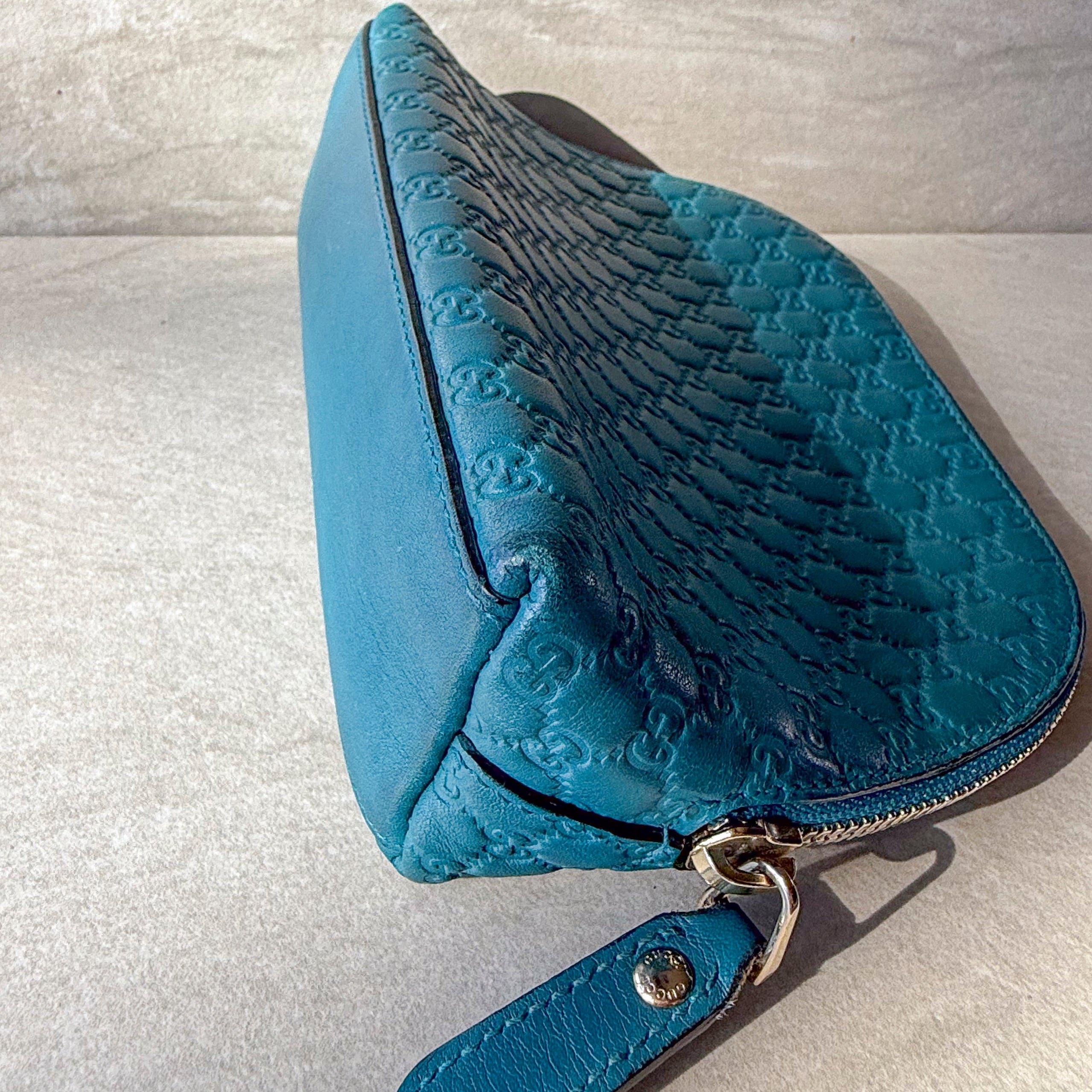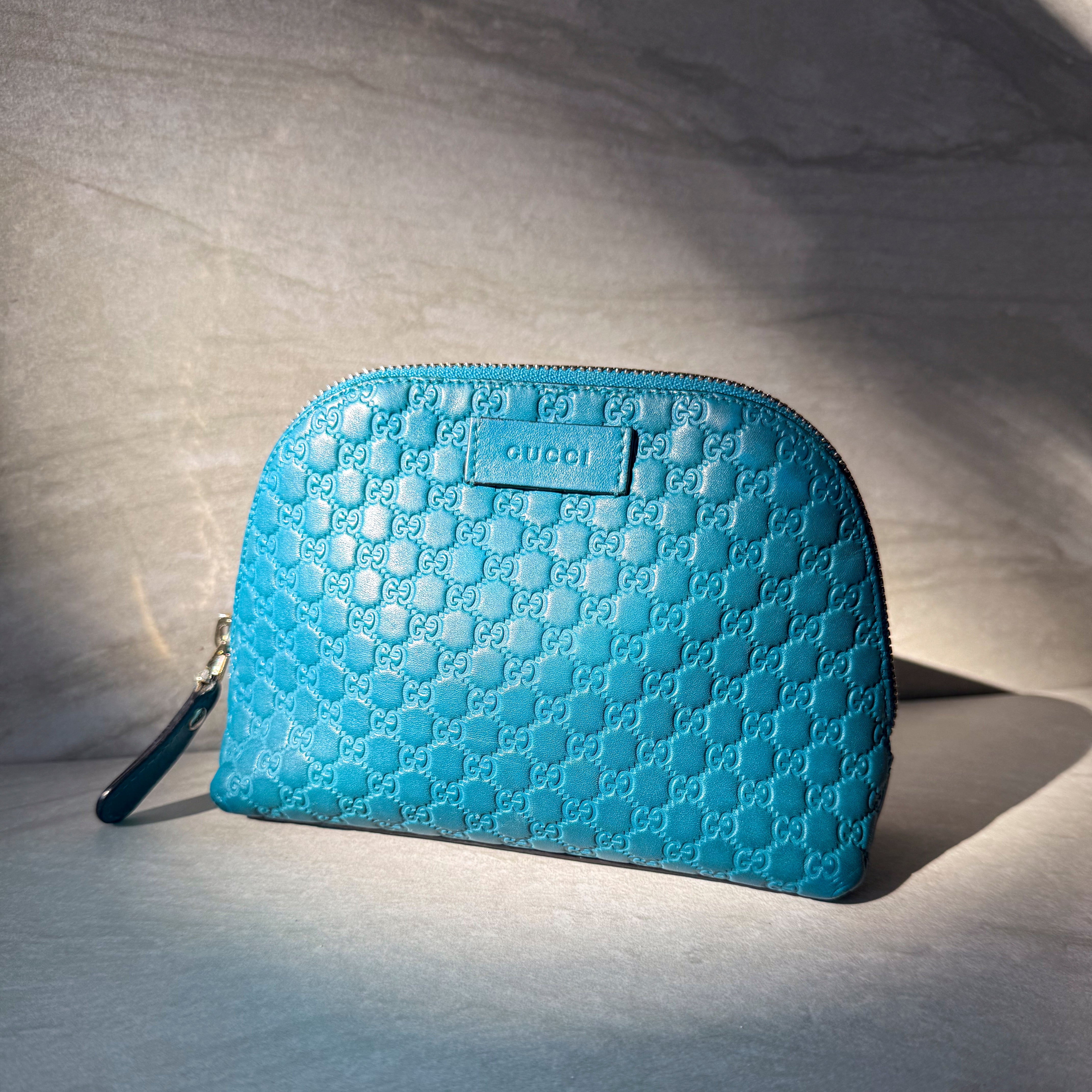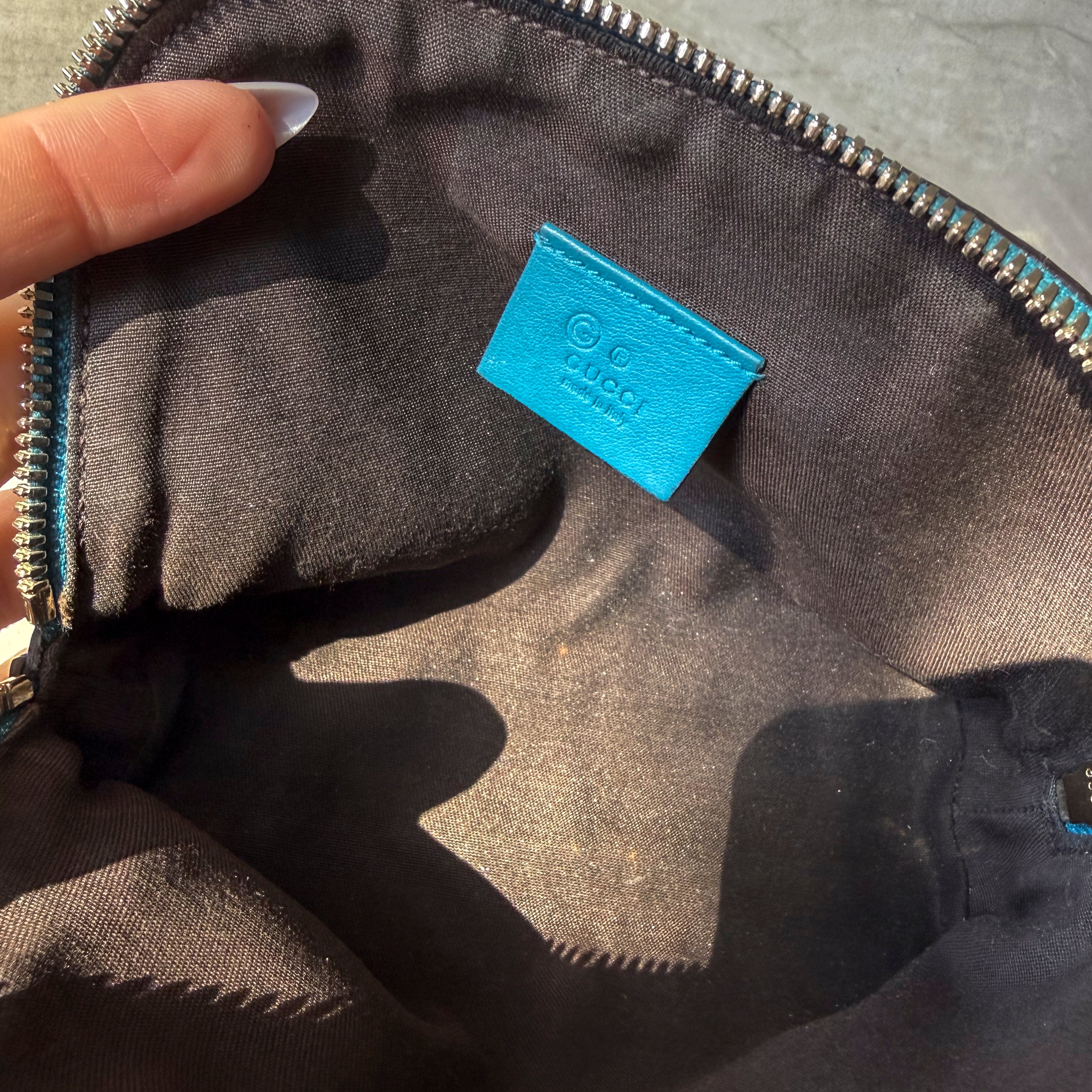 Gucci GG monogram canvas cosmetic pouch in teal. Leather trim. Zip closure.