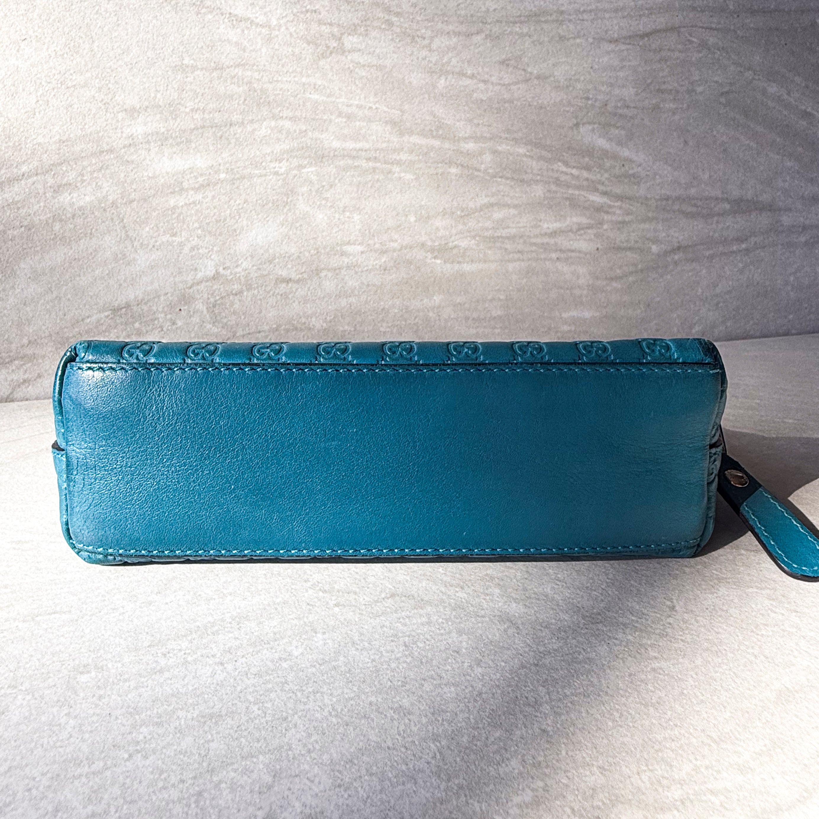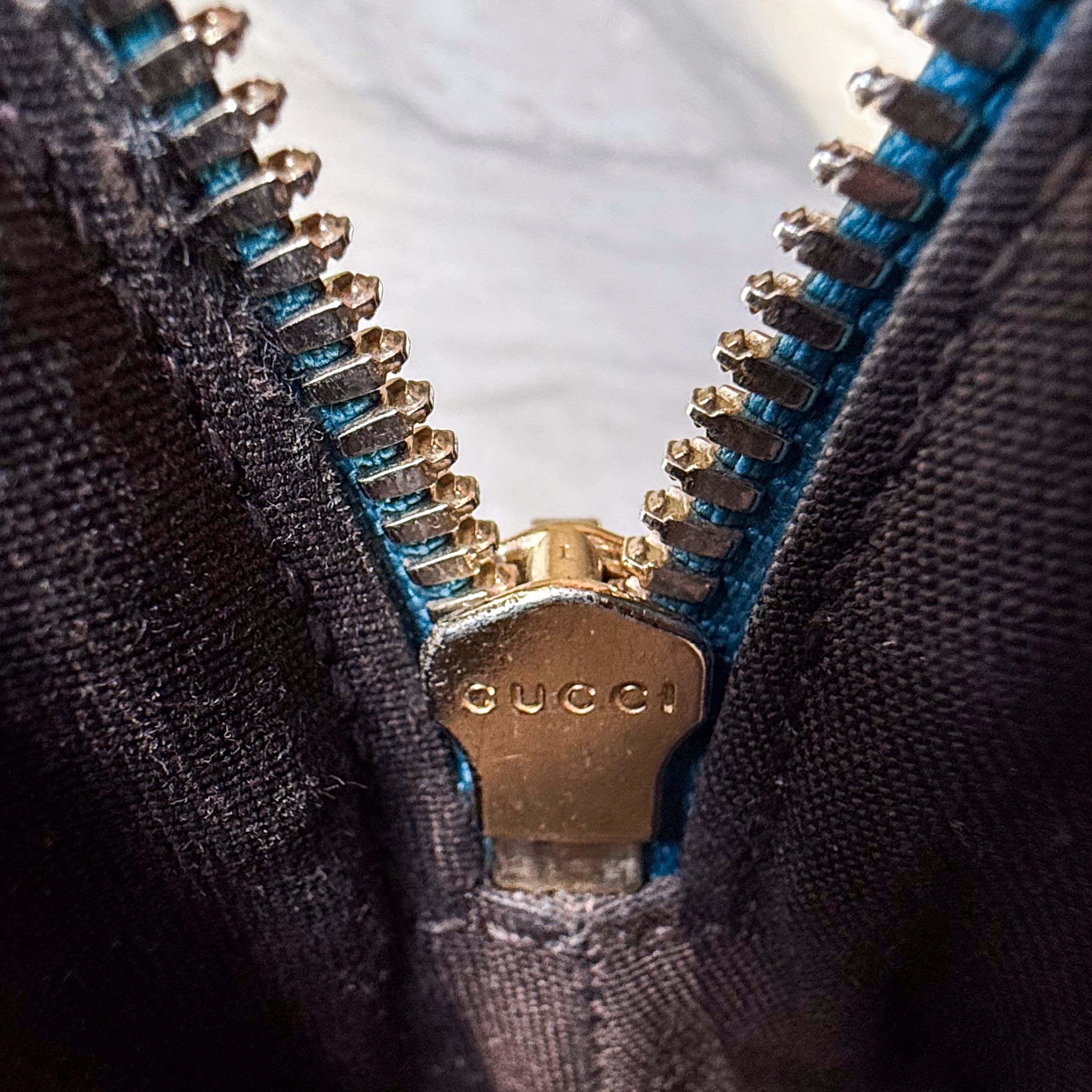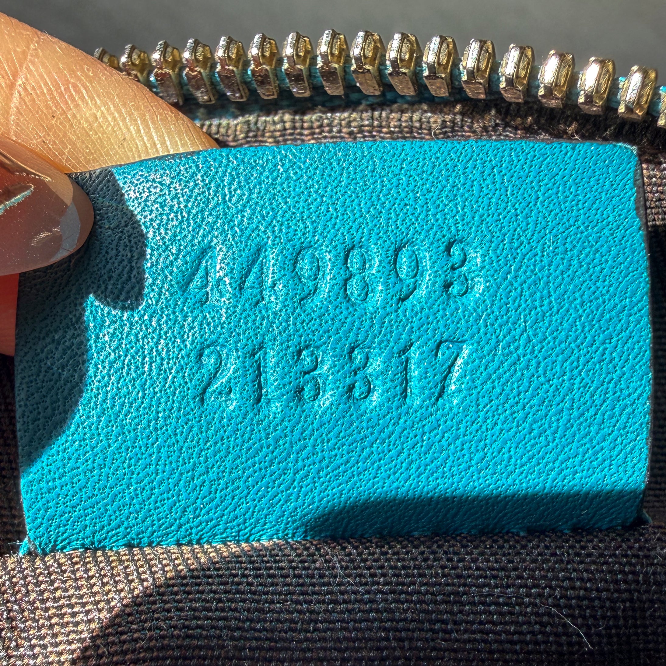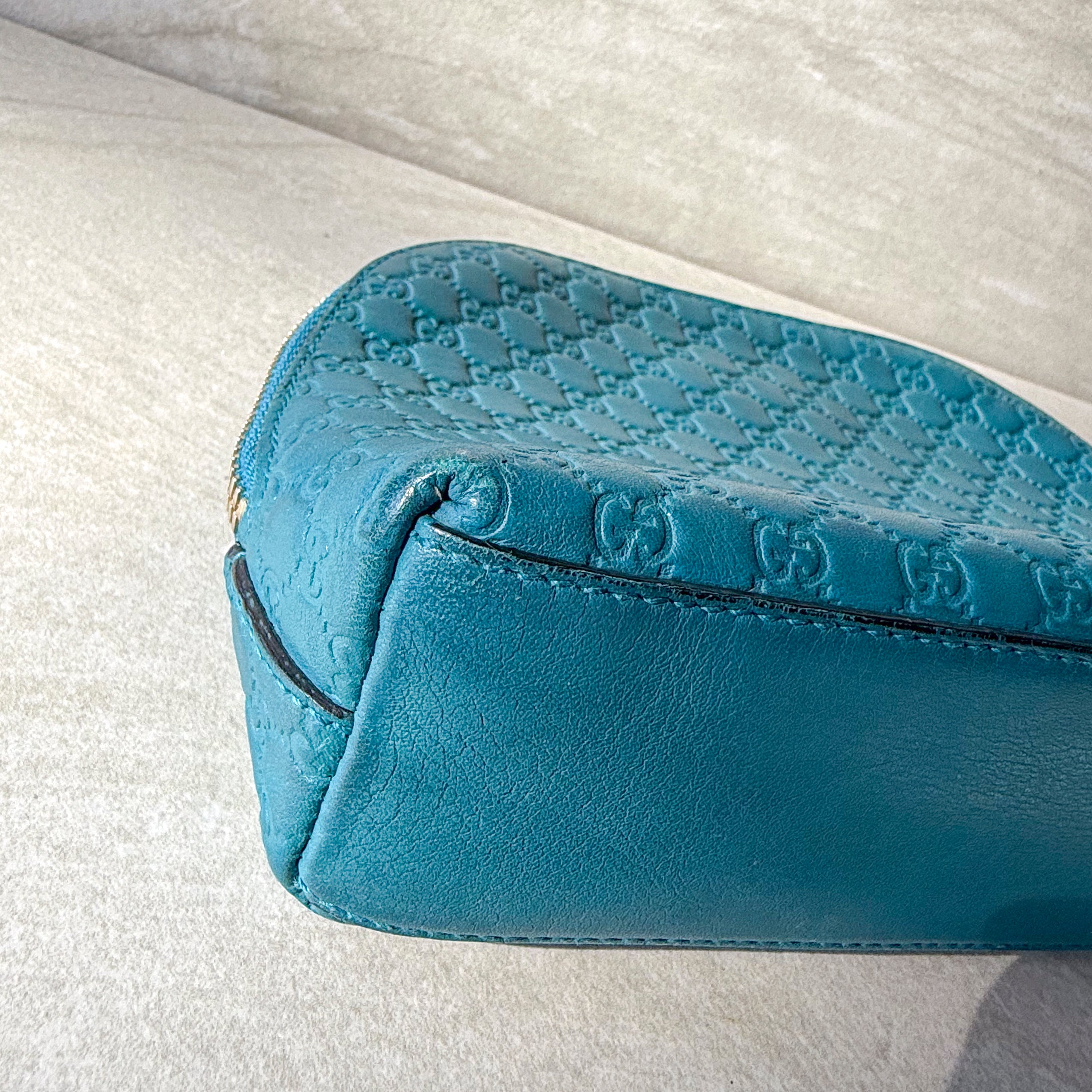 Gucci GG monogram canvas cosmetic pouch in teal. Leather trim. Zip closure.