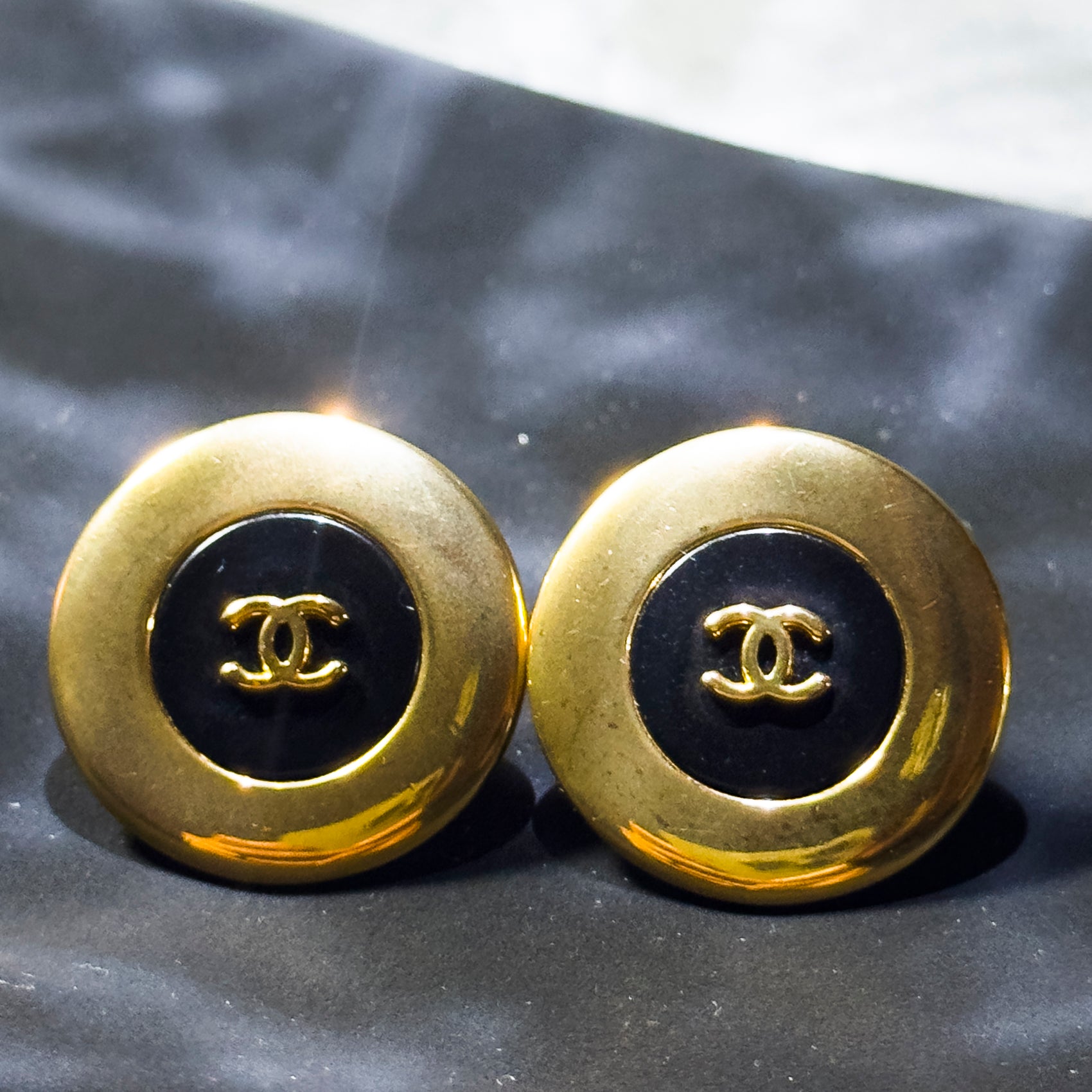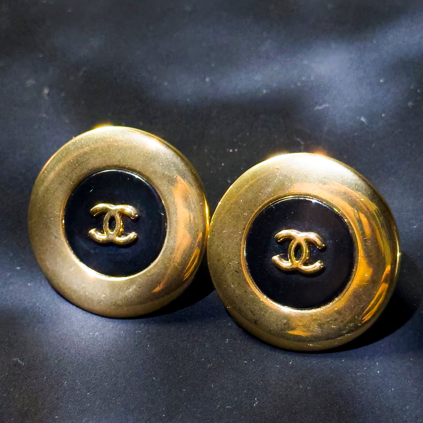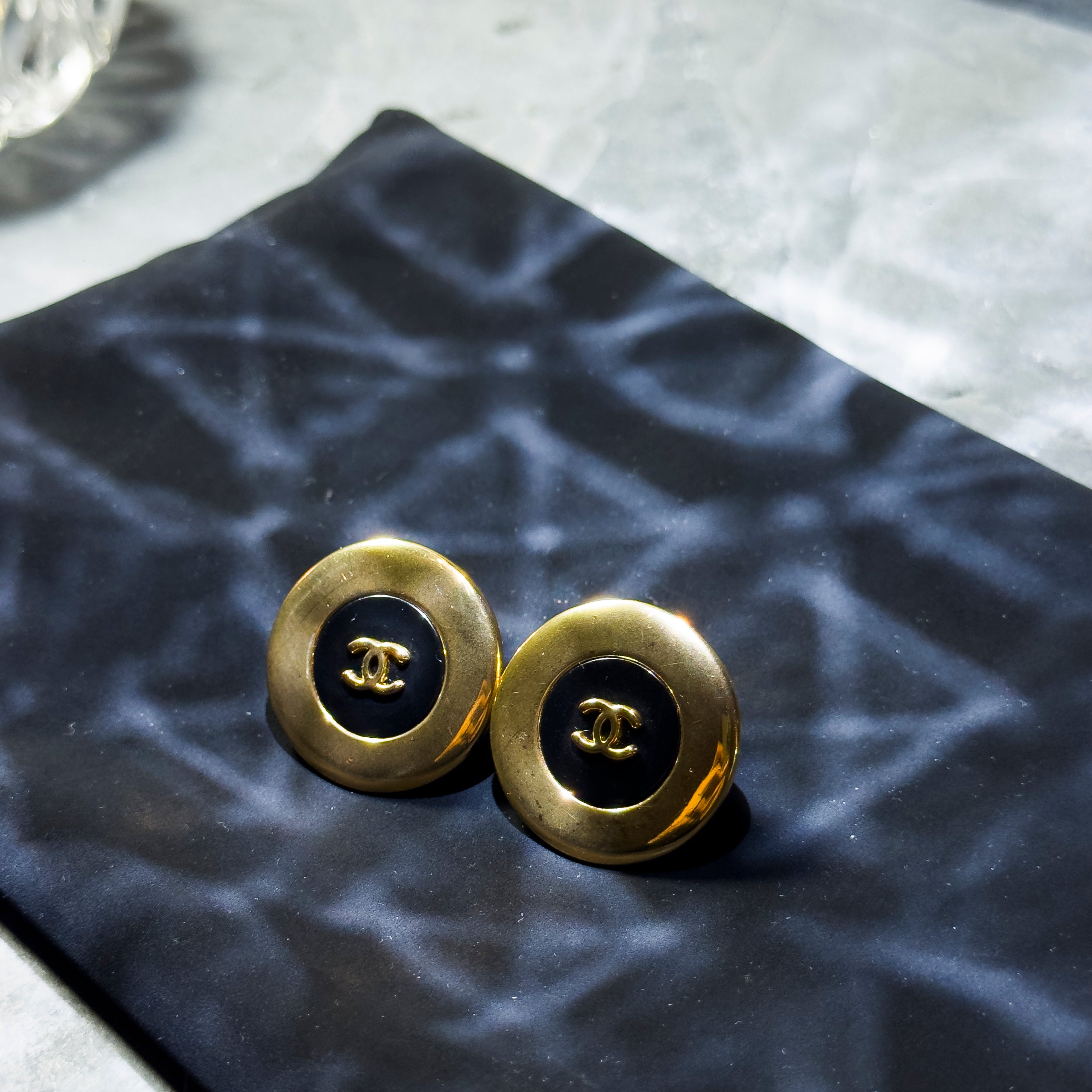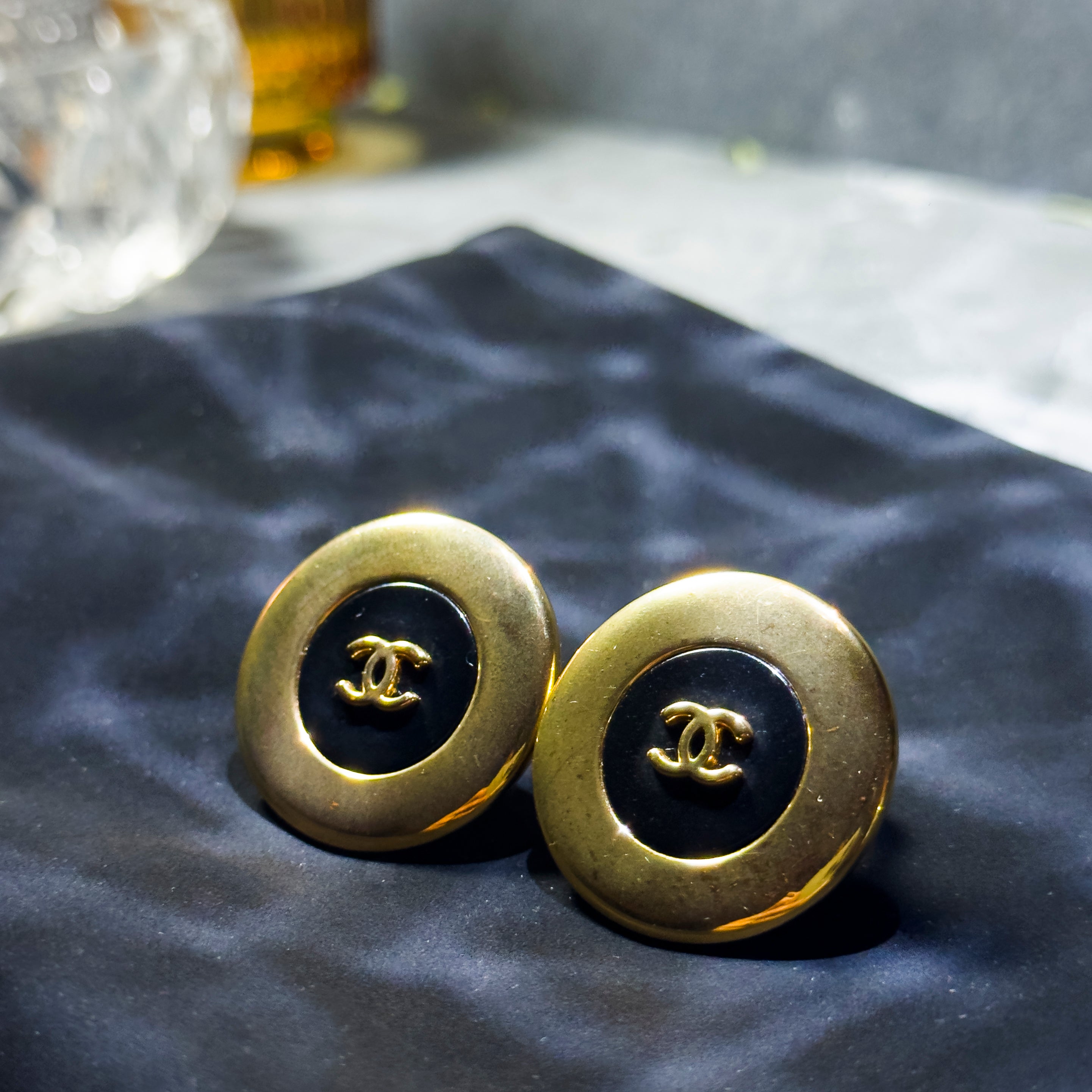 Vintage Chanel black CC button earrings. Gold-tone metal with black enamel center and raised interlocking CC logo. Post back closure. 1990s. Comes with box. Authenticated.