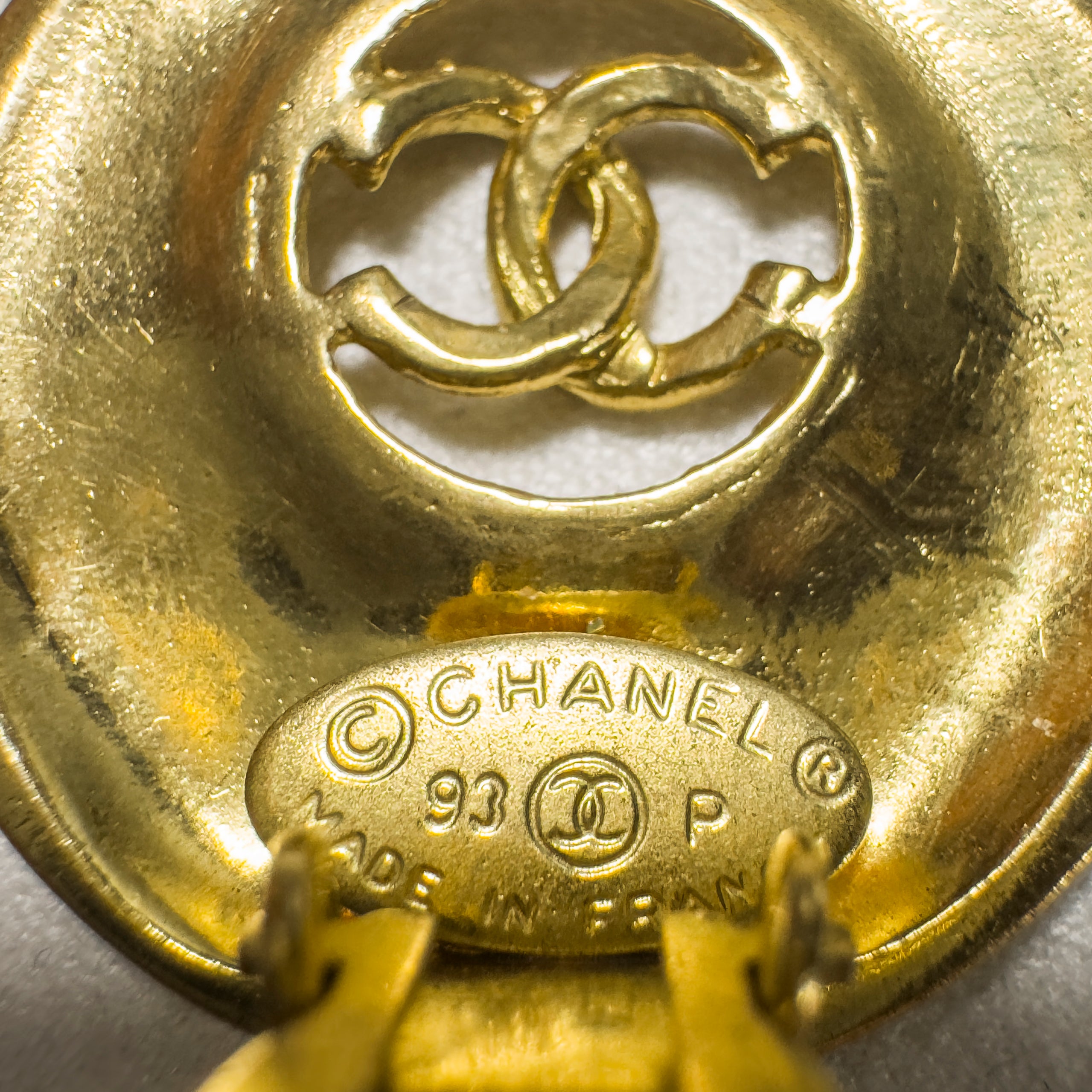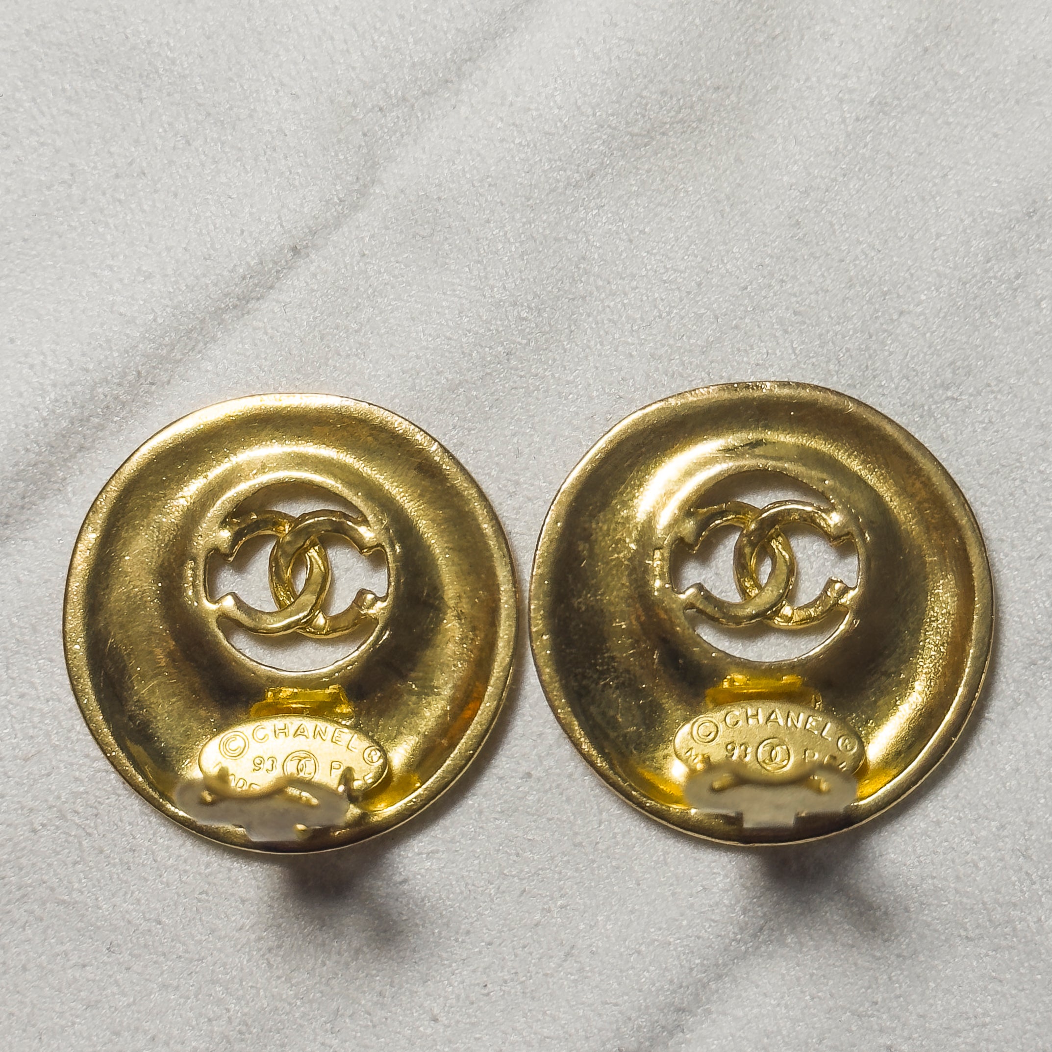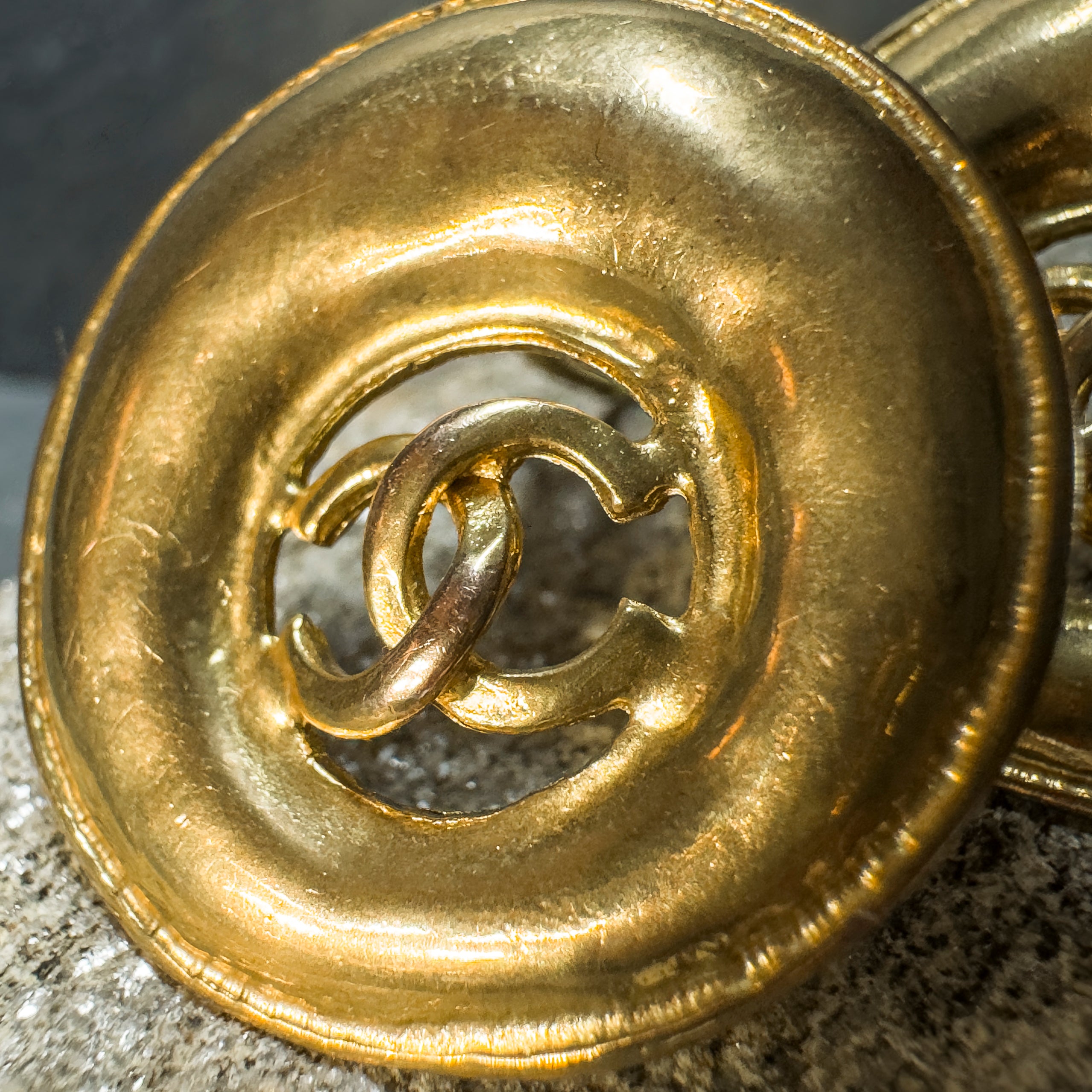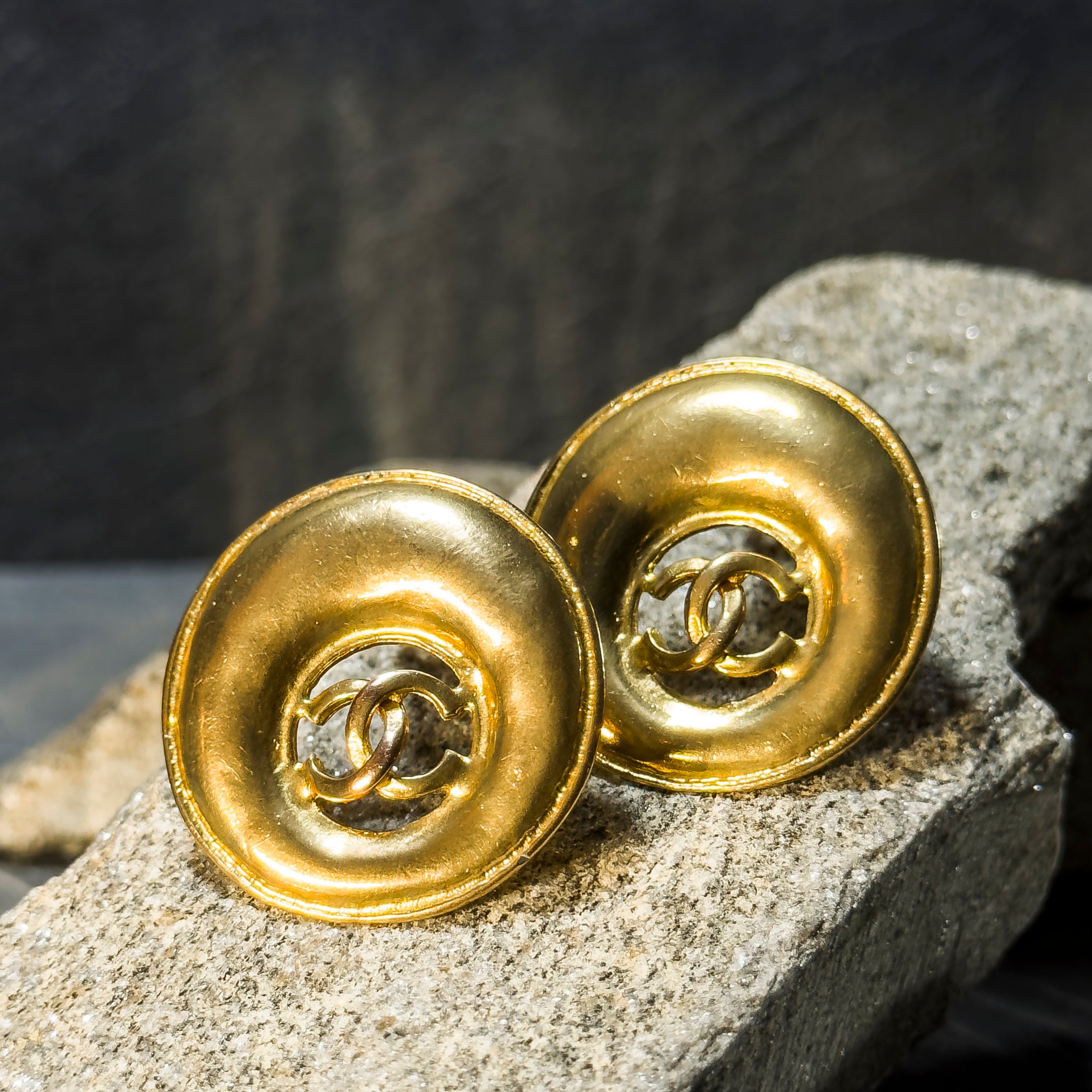 Authentic vintage Chanel hollow CC button earrings crafted in gold-tone metal. Featuring a sculptural concave design with a raised interlocking CC logo. These earrings showcase the craftsmanship and timeless appeal of Chanel’s vintage costume jewelry.